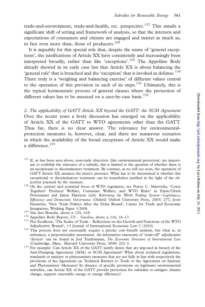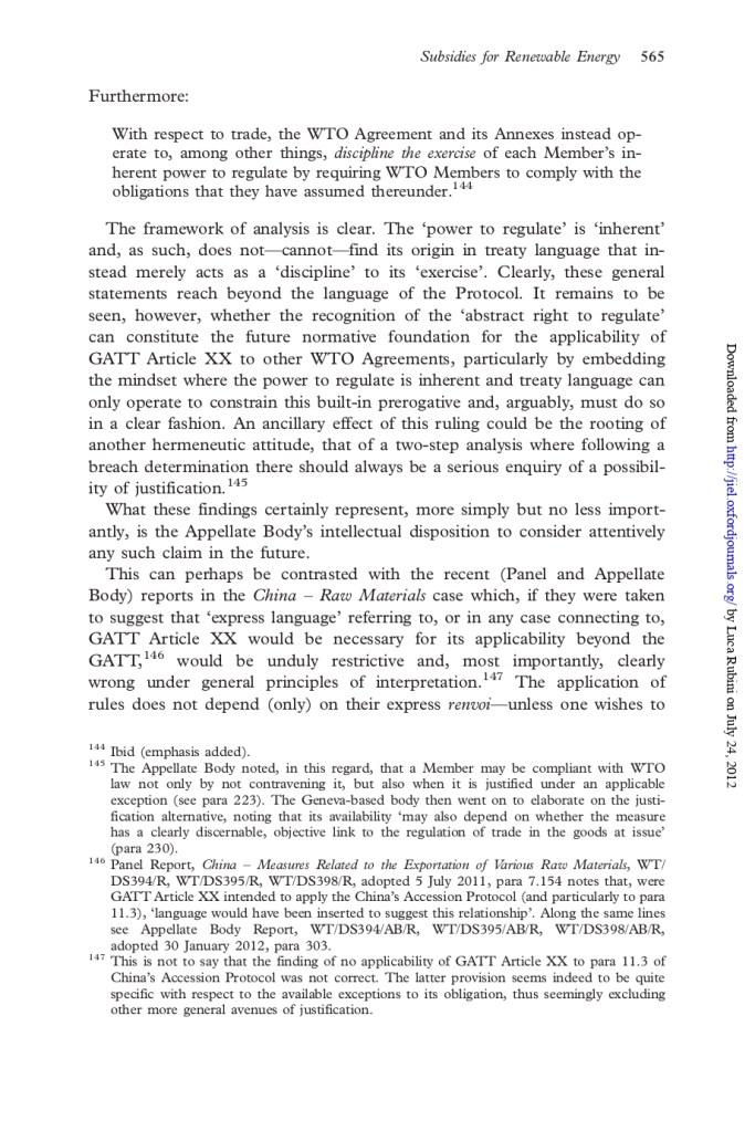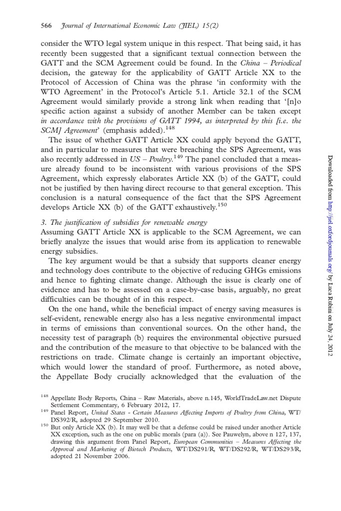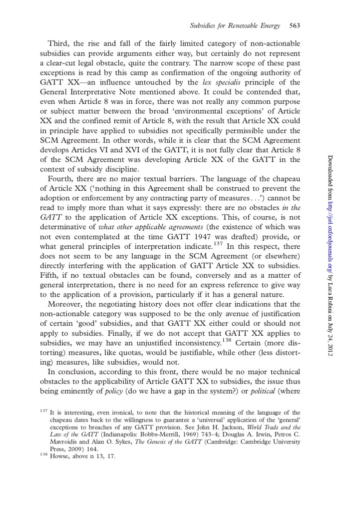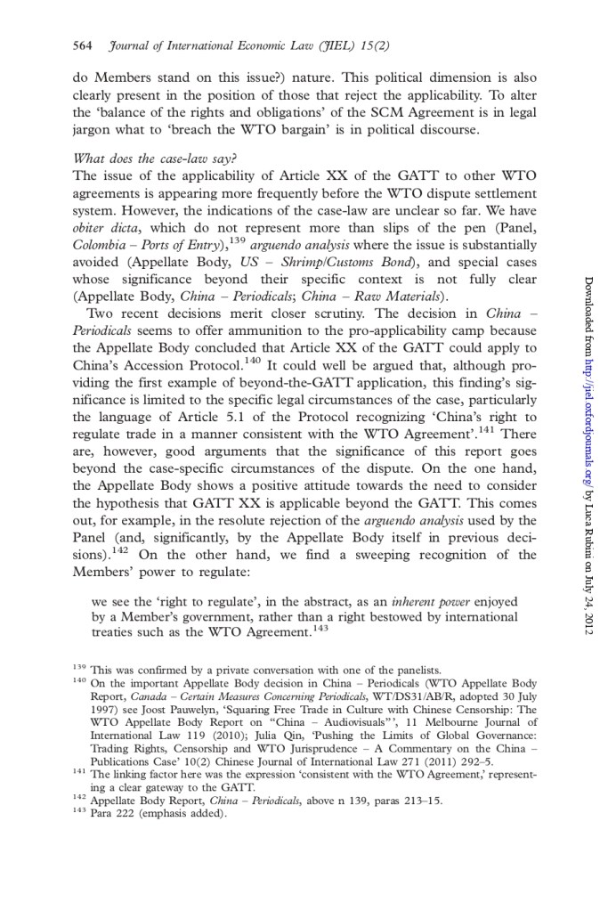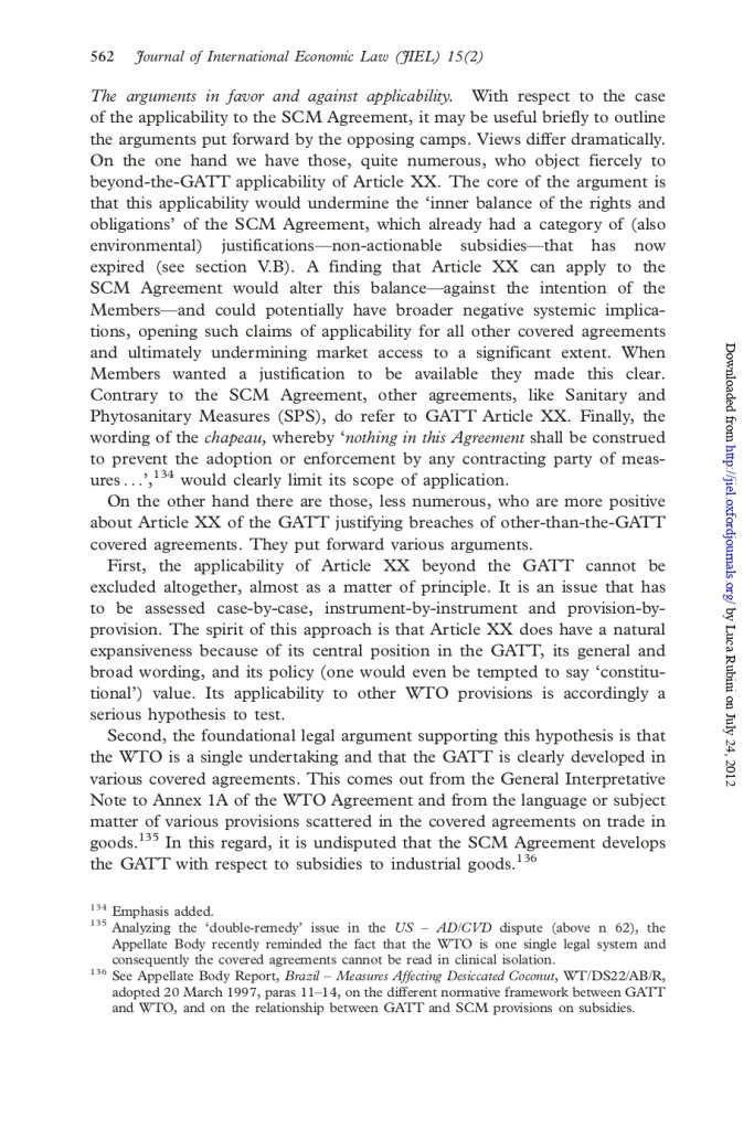 Beyond the technicalities, the issue is eminently political because in the end the legitimacy of using general exceptions in an innovative way may be subject to DS and subject the latter to undue pressure – which is not good. In a 2012 JIEL article (Ain’t Wastin’ Time No More) I provided a summary of the various arguments in favour and against the applicability of GATT XX to the ASCM, and offered my two cents on the broader systemic-political implications, should the DS have accepted this. (You can find, for your convenience, the key pages below. But read the full article to fully appreciate the context!)
