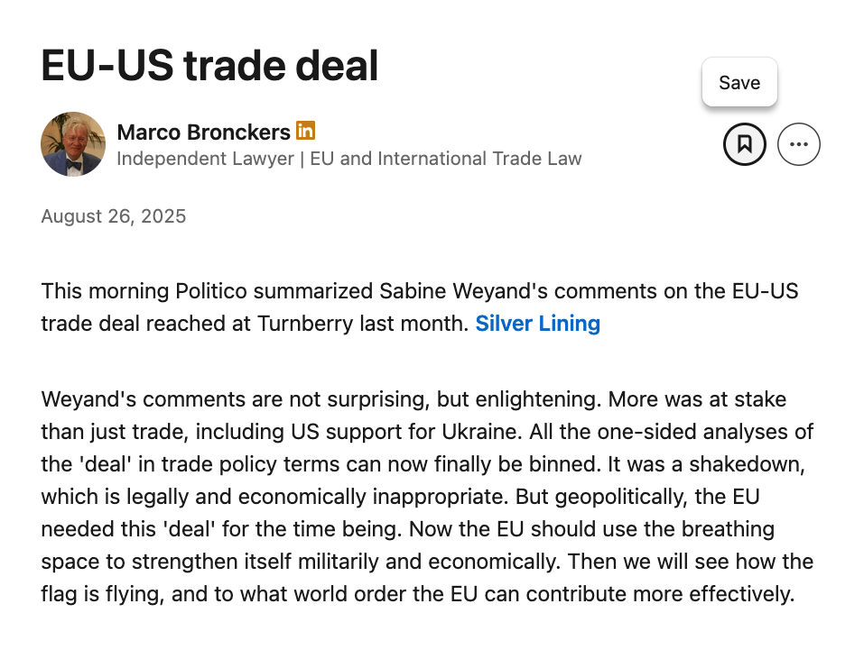 Second. Trying to contextualise the deal, and drawing on an article in Politico published yesterday, Marco Bronckers wrote a short-and-sweet article on LinkedIn.